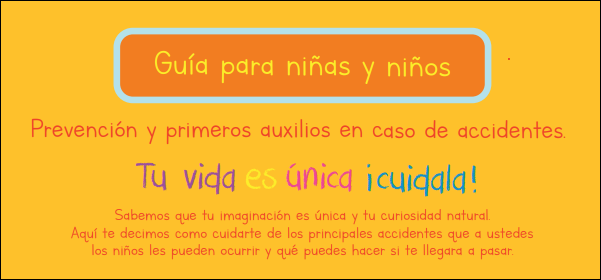 Guía de prevención de accidentes y primeros auxilios para niños y niñas donde podrán encontrar tips de prevención y primeros auxilios en caso de accidentes.